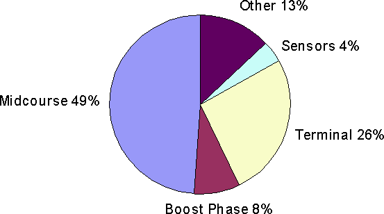 Fiscal Year 2001 was the last Clinton budget, and in it missile defense had $ 5.4 B. This rose by 44% to $ 7.7 B in the first Bush year, and appears to be holding at about this level for 2003. Interestingly though, the budget between the various programs is divided in about the same proportions as in Clinton's last budget, as the pie chart shows. In particular, the Clinton era ground-based mid-course system continues to receive the lion's share, rising from 47% to 49%.