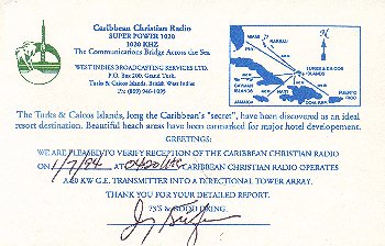 TURKS & CAICOS ISLANDS: Caribbean Christian Radio, 1020 kHz. January 1994.
