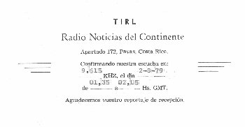COSTA RICA: Radio Noticias del Continente, 9615 kHz. August 1979.