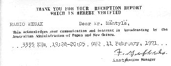 PAPUA NEW GUINEA: Radio Wewak, 3335 kHz. February 1971.