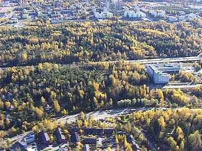 Taaemmassa metsäalueessa on tällä hetkellä iso aukko. Siihen rakennetaan Kehä II toisen pään hypermarket eli Matinkylän uusi keskus.