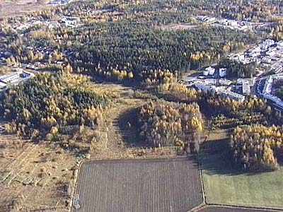 Latokasken niityltä kohti Eestinkalliota eli luoteesta kaakkoon. Keskellä oleva pieni metsikkö on Pisankumpu. Oikealla puolella näkyvä tiheä asutus on aluerakentamissopimuksen ja konkurssiin mennen Hakan saavutuksia.