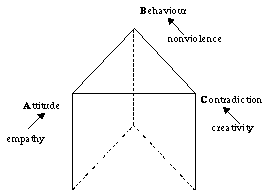 Tämän kolmion alla Galtung kertoi olevan vielä syvämerkityksiä, syvä käyttäytyminen ja syvällä olevat asenteet, joita ihminen ei itse tiedosta. Kun ihmisten tai ihmisjoukkojen päämäärät ovat ristiriidassa keskenään, syntyy helposti selkkaus. Kun yksi (tai useampi) osapuoli ensin käyttää väkivaltaa toista (tai muita) osapuolia kohtaan, johtaa se selkkauksen jälkeen koston kierteeseen. Näin tapahtuu varsinkin siksi, että selkkauksessa yleensä kuolee huomattavasti vähemmän ihmisiä, kuin selkkauksessa tulee raiskattuja tai muuten kärsineitä, jotka jäävät hautomaan kostoa. Ei vain kahta osapuoltaEräs ydinajatuksista oli se, että selkkauksissa ei yleensä koskaan ole vain kahta osapuolta, ja vielä vähemmän yhtä hyvää ja yhtä pahaa osapuolta, vaan lukuisia. Jugoslavian konfliktissa Galtung laski olevan 27 eri osallistuvaa ryhmää. Galtung kertoi aikoinaan opiskelleensa matematiikkaa ja hän kuvasi tilannetta matemaattiseen tapaan, että on olemassa m kappaletta osapuolia ja n kappaletta keskenään erilaisia päämääriä, ei vain kahta osapuolta ja niillä kummallakin yhtä päämäärää. Matemaattisen yhtälön avulla voidaan kuvata myös tilannetta, jossa on selvitettävä 'matemaat-tiset' itsestään selvyydet, joita kukaan ei tule maininneeksi. Galtung korosti sitä, että konflikteja ei itse asiassa ratkaista, vaan ne pitää muuntaa rauhanomaiseksi toiminnaksi. Kun osapuolien kesken keskustellaan heidän unelmistaan, minkälaisen tulevaisuuden he maalleen tai kansalleen haluaisivat, voidaan eri osapuolien yhteiset toiveet yhdistää. Koskaan syyllisyys konflikteista ei ole vain yhdellä osapuolella, asiat eivät ole mustavalkoisia, vaan kaikkien osapuolien on muututtava. Toista osapuolta on kuunneltava, paholainenkaan ei puhu aina kuin paholainen. Tähän muuttumiseen tarvitaan empatiaa, sydäntä, sen avulla vaikutetaan asenteisiin ja käyttäytymiseen. Kaikkien osapuolien käyttäytymisen on muututtava väkivaltaisesta väkivallattomaksi. Tulevaisuuden ratkaisujen löytämiseen tarvitaan aivojen luovuutta. Galtungin kolmiossa empatia kohdistuu kolmion vasempaan kärkeen, väkivallattomuus ylimpään kulmaan ja luovuus oikeaan kulmaan, ristiriidan juureen. Rauhanvälittäjä arvostaa naisiaGaltung kertoi yhtenä esimerkkinä sen, miten heinäkuussa 1994 Rambouilletin kokouksessa Ranskan entisen presidentin puoliso Danielle Mitterrand oli kutsunut kurdien kahden keskenään taistelevan osapuolen edustajat, Kurdien isänmaallisen puolueen (PUK) Talabanin ja Kurdien demokraattisen puolueen (KDP) Barzanin sekä Irakilaisten edustajat ja Galtungin itsensä neuvottelemaan rauhasta. Kokous ei johtanut mihinkään ratkaisuun. Taistelevien osapuolien saaminen yhteen oli ylipäänsä onnistunut vain, koska molempien osapuolien kurdinaiset, ennen kaikkea isoäidit (Women in Black, Mustiinpukeutuneet naiset), olivat marssineet taistelevien osapuolien väliin osoittamaan mieltään. Kokouksessa Transcend vaati turhaan väkivallatonta lähestymistapaa selkkaukseen ja enemmän naisia johtaviin asemiin kurdien kulttuurissa. Kurdien tavoitetta omasta valtiosta Galtung piti hyväksyttävänä, mutta hyvin vaikeana toteuttaa, koska sitä vastustavat myös USA ja Israel, jotka pelkäävät, että intiaanit ja palestiinalaiset ottaisivat siitä mallia ja saisivat tukea vaatimuksilleen. Galtung korosti muutenkin sitä, että konfliktien muuntamisessa tarvittavaa empatiaa on varsinkin naisilla, psykologeilla ja uskovaisilla. Tässä hän tarkoitti uskovaisilla muita kuin kaikkien uskontojen piirissä esiintyviä fundamentalisteja. Transcend-menetelmä on kehitetty yhdistämällä parhaita piirteitä kuuden maailman uskonnon, hindulaisuuden, buddhalaisuuden, kristinuskon, taolaisuuden, islamilaisuuden ja juutalaisuuden ajatuksista. Jugoslavian tilanteesta Galtung puhui useaan otteeseen, samoin Pohjois-Irlannista ja Palestiinasta. Pohjois-Irlannin selkkauksessa hän laski mukana olevan myös vähintään kuusi osapuolta. Siinä kuitenkin 85 % kaikkien osapuolien edustajista haluaa vain rauhaa, vain 15 % pitää yllä selkkausta. Siksi rauhanvälityksessä pitää keskittyä nimenomaan tähän kaikkien osapuolien vähemmistöön. Vieraalta kysyttiin sekä seminaarissa, että myös sitä seuranneessa illanvietossa, miksei Transcend-verkostossa ole yhtään suomalaista, mutta selvää vastausta hän ei siihen antanut. Tanscend-verkostolla on kotisivut internet-osoitteessa: http://www.transcend.org, jossa oleva (englannin kielinen) aineisto on kaikkien vapaasti käytettävissä, myös julkaistavaksi suomen kielellä. Transcend verkoston edustaja mukana myös kesän 2000 INES-konferenssissaMinulla oli tilaisuus tutustua Transcend-verkoston ajatuksiin myös viime kesänä Tukholmassa pidetyssä INES-konferenssissa, johon osallistuin Mia Leskisen kanssa TEPin edustajana. Mian kirjoitus konferenssista julkaistiin TEP-tiedotteessa 3/2000. Konferenssissa osallistuin työryhmään, jonka aiheena oli Kohti aseistariisuntaa ja rauhan kulttuuria. Työryhmän vetäjänä toimi espanjalainen Juán Gutiérrez, joka on myös Transcend-verkoston jäsen. Ryhmämme oli pieni, Juanin lisäksi meitä oli vain kuusi osallistujaa, joista suurin osa oli nuoria opiskelijoita eri maista. Käsittelimme rauhan kulttuuria Galtungin kolmiomallin avulla, mutta Juan oli muokannut sitä jonkin verran. Hän oli lisännyt siihen myös ajallisen jatkuvuuden, miten väkivallasta asenteita ja käyttäytymistä muuttamalla vähitellen ratkaistaan konfliktit. Ylipäänsä käsittelimme aihetta ennemmin yleiseltä ihmisten käyttäytymisen ja kulttuurin, kuin rauhanvälityksen kannalta. Juán Gutiérrez liitti kirjoitukseni alussa kuvattuun kolmioon väkivallan siten, että sen kulmissa asenteet liittyivät kulttuuriseen väkivaltaan, kuten rasismiin, ristiriidat rakenteelliseen väkivaltaan kuten apartheidiin ja käyttäytyminen, käytännössä ihmisten teot, liittyi tekoihin eli taisteluihin ja suoranaise