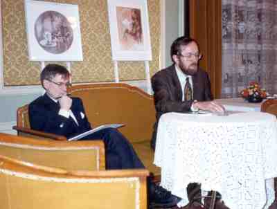 Kymmenvuotisjuhlakokouksessa puhetta johti Antero Honkasalo.Claus Montonen, vasemmalla, toimi TEPin puheenjohtajana vuodet 1994-1996.