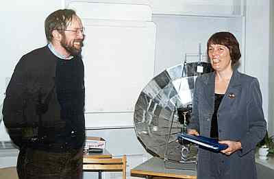TEPin perustajajäsen Satu Hassi saa paraboloidikeittimen nykyiseltä puheenjohtaja Antero Honkasalolta.